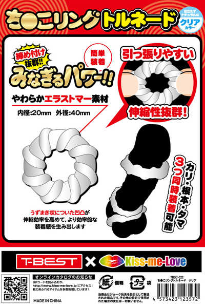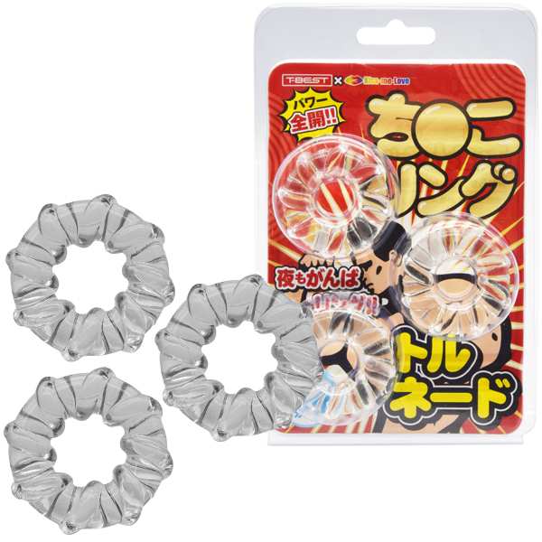 <T-BEST×KISS-ME-LOVE>夜もがんばリングで大人気のやわらかメンズリング「ち●こリング」が、トルネードになって新登場!今度のち●こリングは「特殊形状3個セット」!トルネードデザインのリングを3つもセットにしました!うずまき状に巻き付いた凹凸が伸縮率を高めてより効率的な装着感を生み出します。合わせて使えば三点同時装着が可能となります!高い耐久性のやわらかエラストマー素材に引っ張りやすい簡単装着デザイン目立たずナチュラルを演出するクリアカラー!締め付け抜群みなぎるパワー!