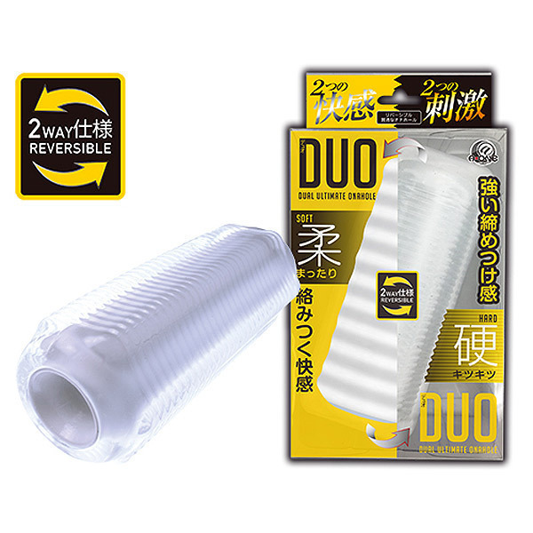 ソフトとハードの刺激をこれ一つで♪ひっくり返して使う両面仕様のリバーシブルオナホール「DUO(デュオ)」。●裏返して使うリバーシブルタイプ●ハード:クリア素材の細ヒダ構造●キツキツなゴリヒダの強刺激快感●ソフト:ふわふわ白素材の柔構造●にゅるっとまったり絡みつく快感●裏返しやすく洗浄しやすい貫通型。気分に合わせて使い分け♪表と裏で異なる挿入感を楽しめる2WAY仕様のオナホール。にゅるっと絡みつくソフトな快感と、ゴリヒダ刺激のハードな快感をお楽しみ下さい。