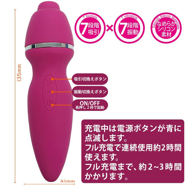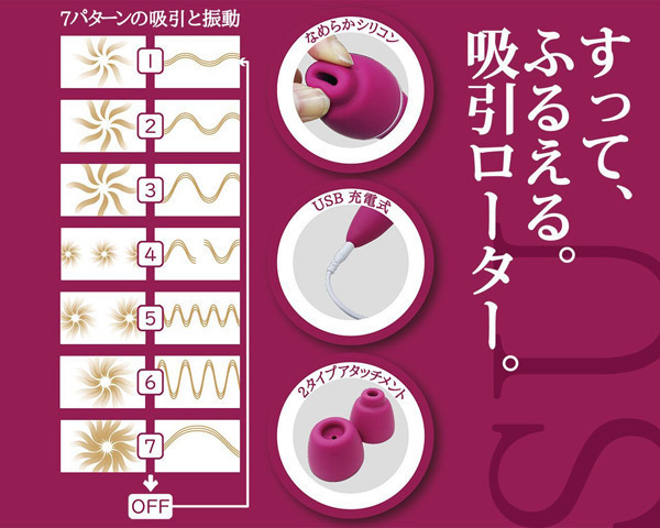 すって、ふるえて、おるがずむ♪乳首もクリも逃さずフィットする、2タイプのアタッチメントが付属した吸引ローター「すぅ」。乳首にぴたっ!クリにぴたっ!吸い逃さない設計でしっかり捉えるなめらかシリコン素材のアタッチメントが付属。多彩なバリエーションを楽しめる7段階吸引×7段階振動を搭載!USBでの充電約2〜3時間で約2時間使用可能(使用状況、環境により時間が変化する場合がございます)。