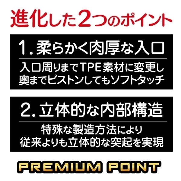 非貫通オナホとして瞬発力を重視したクイックタイプです♪10年以上にわたり愛されてきた定番シリーズが、プレミアム仕様でさらに進化しました!入口には肉厚で柔らかい素材を採用し、手にしっかりなじむ形状になっています♪内部にはイボとヒダがぎっしり配置されており、動きに応じて刺激の変化を楽しめます!上下で異なる凹凸構造になっているため、向きを変えることで新たな感触を体験できます♪ローションは充填済みで、開封後すぐに使用できる便利な設計です!重さは約155gで持ちやすく、使い捨てタイプながらしっかりとした操作感も魅力です♪非貫通構造で衛生的に使え、手軽さと機能性を兼ね備えたおすすめのアイテムです!クイックに満足したい方にぴったりの一本です♪