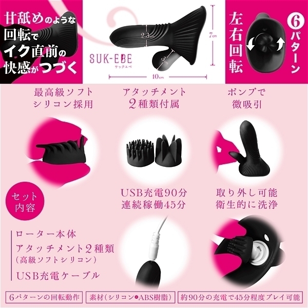 優しく舐めるから、イク直前の感覚がつづく。それが「ヤバ回転ローターNEBURINGUS−ネブリングス−」です。強い振動ばかりに慣れていると感度が鈍くなりませんか?今こそ優しくせつなく敏感な部分を「ねぶり」ましょう。敏感なアソコも胸もどちらもOK!!最初に使うときはお好みのアタッチメントを装着してからご使用ください。極限まで柔かくした高級シリコンブラシが優しく回転して刺激します。(薄めのローションをつけると滑りが良くなります)焦らされるような独特の感覚が、オーガズム直前のもどかしさを再現。左右回転6パターンで飽きさせません。優しさを演出するために敢えて「微」吸引ポンプも設置。ポンプのプッシュでもどかしい吸い付きが更なる焦らしを演出。しかも交換用アタッチメントつきで楽しさ2倍。【セット内容】ローター本体/アタッチメント(高級ソフトシリコン)/USB充電ケーブル。滑らかな感触をお求めの場合はローションをご利用ください。・6パターンの回転動作・約90分の充電で45分程度楽しめます●タイプB
