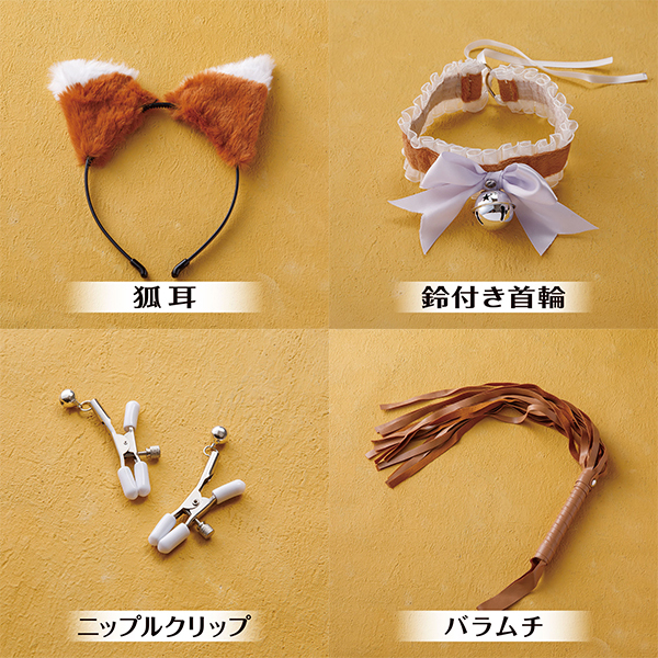 ¥2570(定価3960)パッケージ:17.0×22.0×8.0cm 狐耳:17.0×17.0×1.5cm 首輪:34.0×4.0×3.0cm 乳首クリップ:6.0×3.0×0.8cm(一個) 尻尾:45.0×7.0×7.0cm バラムチ:5.3×2.6×2.6cm セット内容:豹耳、ニップルクリップ鈴付き、首輪尻尾、バラムチ